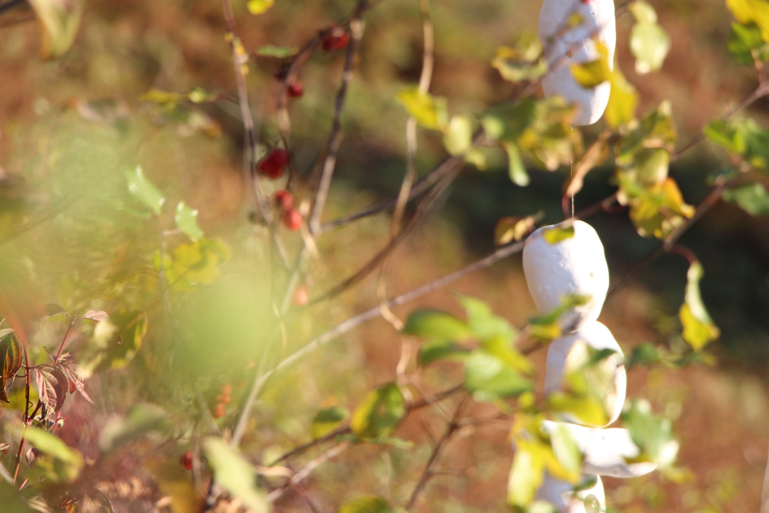 Avec l’aide d’un guide d’escalade, j’ai suspendu aux branches, trois rangées de porcelaines pour illustrer à la fois la vitalité de ce chêne avec son lien à la terre, et sa souffrance. De loin, les porcelaines évoquent des larmes blanches au milieu du paysage d’automne.
